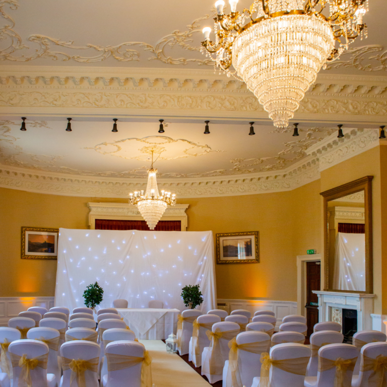 Perfectly suited for transitioning from ceremony to reception, our Ballroom is a timeless space showcasing beautiful original features, including ornate coving, chandeliers, intricate mouldings, and classic rose detailing. It’s the perfect setting for couples seeking a wedding with a refined, historic charm.